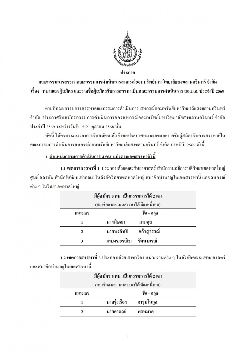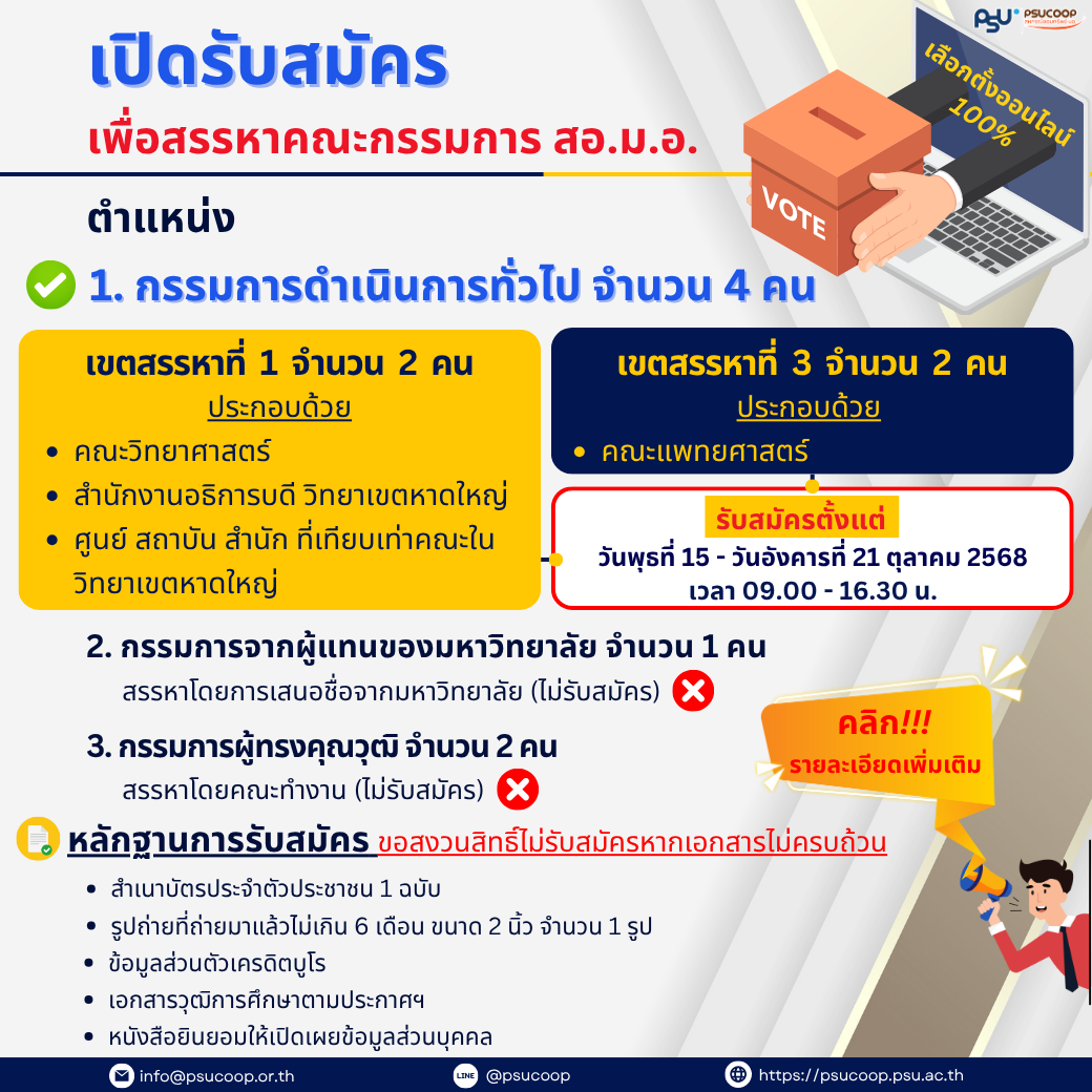 การสรรหาคณะกรรมการดำเนินการสหกรณ์ออมทรัพย์มหาวิทยาลัยสงขลานครินทร์ จำกัด ประจำปี 2569