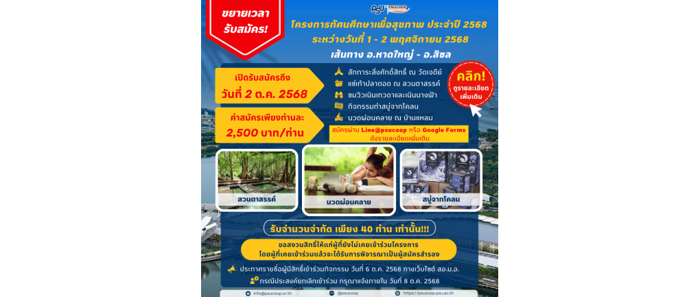 หรือ สมัครผ่าน Line : @psucoop เพียงแจ้งความประสงค์และส่งหลักฐานการโอนเงิน