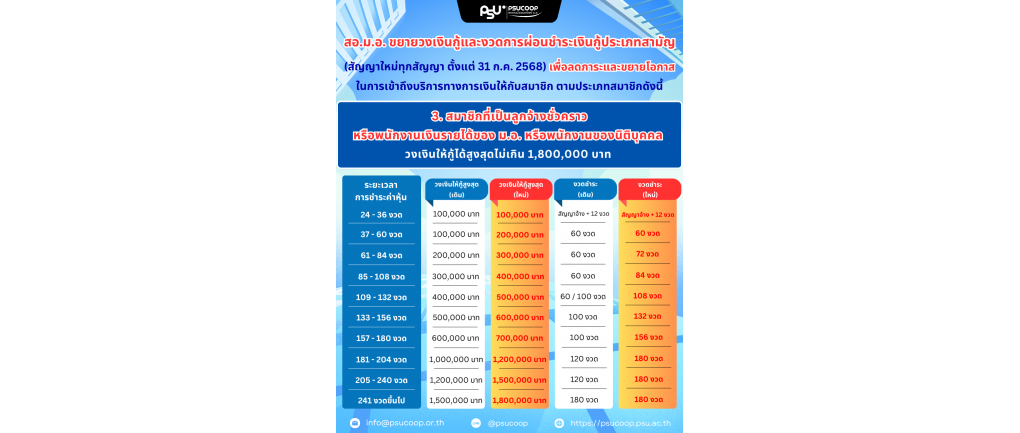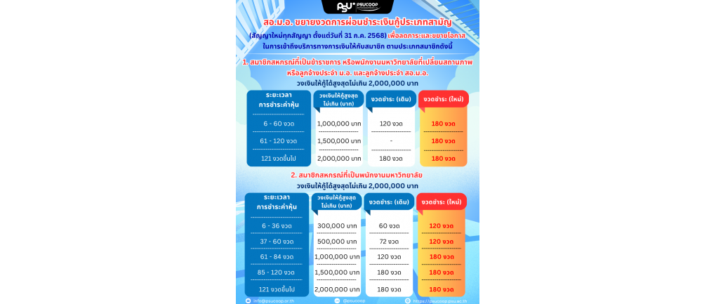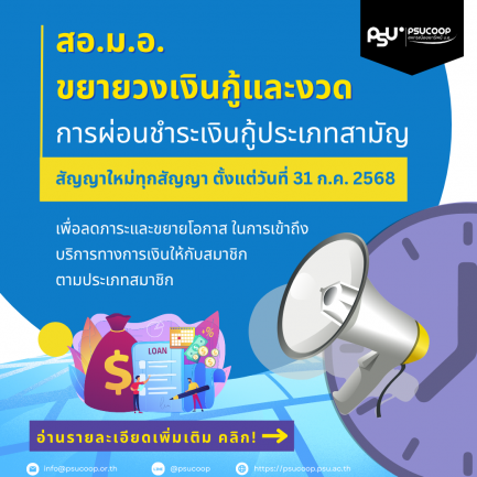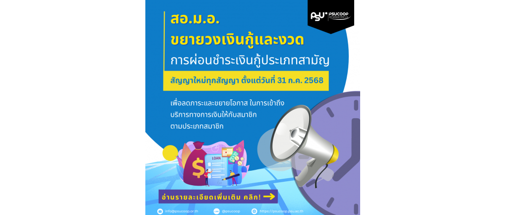 สอ.ม.อ. ขยายวงเงินกู้และงวดการผ่อนชำระเงินกู้ประเภทสามัญ สัญญาใหม่ทุกสัญญา ตั้งแต่วันที่ 31 ก.ค. 2568