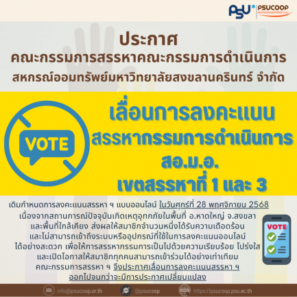 ประกาศ การเลื่อนและกำหนดวันลงคะแนนสรรหาคณะกรรมการดำเนินการ สอ.ม.อ. เป็นวันที่ 19 ธ.ค. 2568
