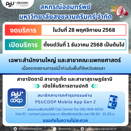 สอ.ม.อ. สำนักงานใหญ่ และสาขาแพทยศาสตร์ เปิดบริการ ตั้งแต่วันที่ 1 ธันวาคม 2568 เป็นต้นไป