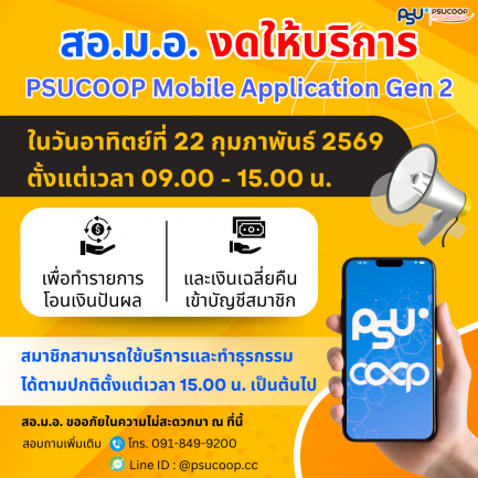 งดให้บริการ PSUCOOP Mobile Application Gen 2 ในวันอาทิตย์ที่ 22 กุมภาพันธ์ 2569