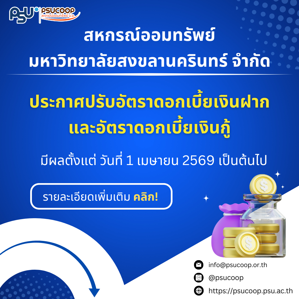 ประกาศปรับอัตราดอกเบี้ยเงินฝาก และอัตราดอกเบี้ยเงินกู้ มีผลตั้งแต่ วันที่ 1 เมษายน 2569 เป็นต้นไป