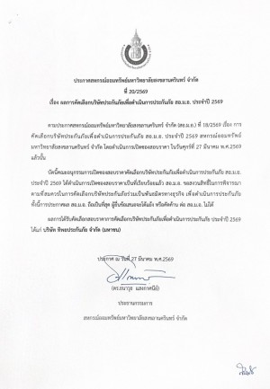 ประกาศ สอ.ม.อ. ที่ 20/2569 เรื่อง ผลการคัดเลือกบริษัทประกันภัยเพื่อดำเนินการประกันภัย สอ.ม.อ. ประจำปี 2569