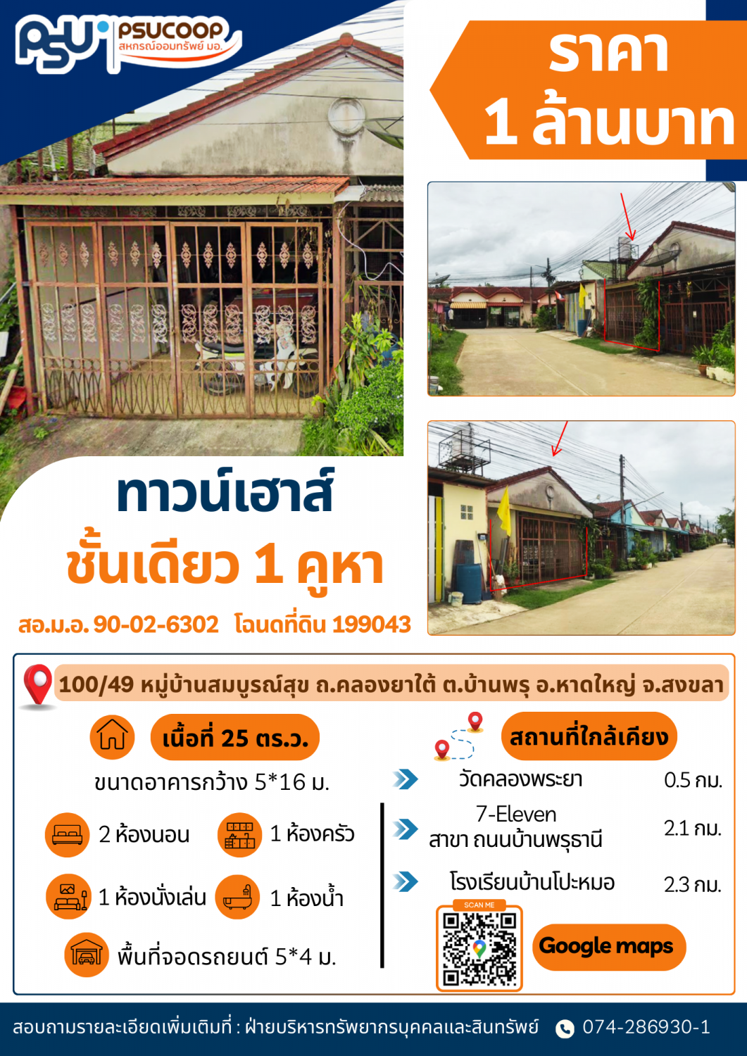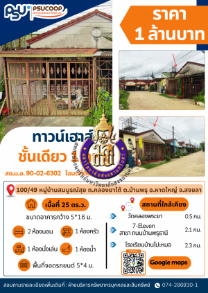 ทาวน์เฮาส์ 1 ชั้น : ที่ตั้ง100/49 หมู่บ้านสมบูรณ์สุข ถ.คลองยาใต้ ต.บ้านพรุ อ.หาดใหญ่ จ.สงขลา